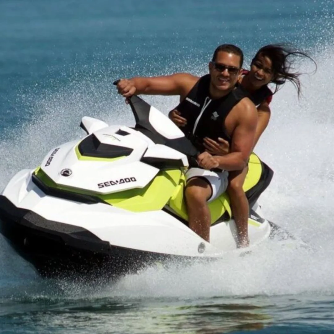 El alquiler de motos de agua en Mil Palmeras es una de las actividades más emocionantes que puedes disfrutar en la Costa Blanca. Si te apasionan la velocidad y la adrenalina, esta experiencia te permitirá combinar ambas mientras surcas las olas del Mediterráneo. Nuestras motos SEA DOO GTS 130 están diseñadas para ofrecer potencia y diversión, ideales tanto para principiantes como para los más aventureros. Puedes conducir solo o con un acompañante, y no necesitas experiencia previa ni titulación náutica.