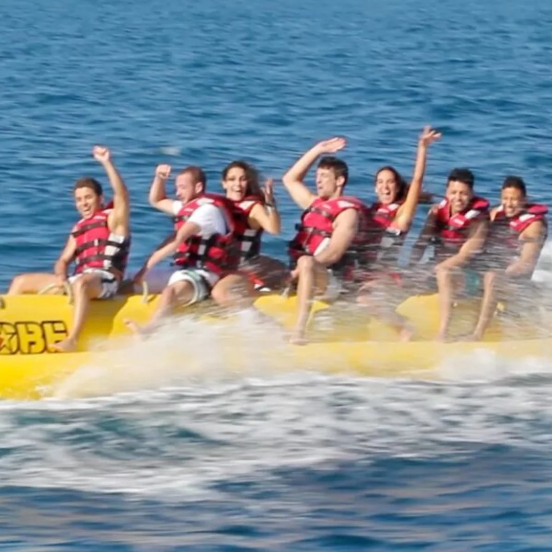 La banana acuática es un gran hinchable remolcado por un potente barco que asegura velocidad y emoción en cada curva. Con capacidad para hasta 10 personas, el desafío está en mantener el equilibrio y no caer al agua mientras sientes la brisa marina y el vaivén de las olas. ¡Agárrate fuerte y prepárate para disfrutar de una actividad llena de momentos inolvidables! Eso sí, es necesario saber nadar y la edad mínima para participar es de 12 años, por lo que es perfecta para adolescentes y adultos que buscan una experiencia compartida.
