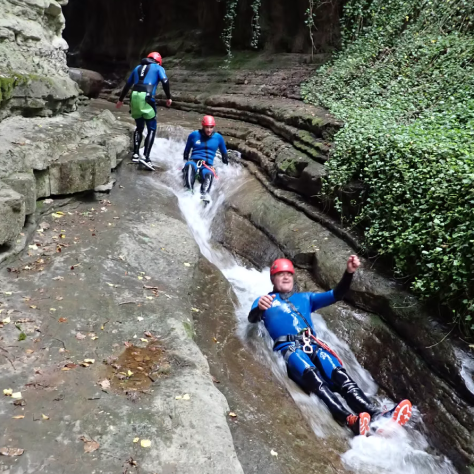 El descenso comienza con dos rápeles iniciales de 22 m y 10 m, que nos adentran en una imponente garganta rodeada de rocas flysch y vegetación exuberante. A medida que avanzamos, nos encontramos con un impresionante salto de 8 m, con la opción de sustituirlo por un emocionante tobogán natural. En sus aguas cristalinas pueden verse anfibios y reptiles, añadiendo un atractivo extra a la experiencia.
