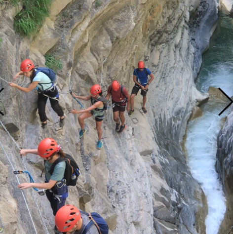 El descenso comienza con pequeños resaltes, perfectos para familiarizarse con el entorno y apreciar las vistas. A medida que avanzamos, nos enfrentaremos a un rápel de 13 metros, con la opción de realizar un salto de 10 metrospara aquellos que buscan un extra de emoción. Más adelante, el recorrido nos lleva hasta un tobogán vertical, una sección emocionante en la que se puede elegir entre deslizarse, hacer un rápel de 10 metros o realizar un salto de 8 metros.