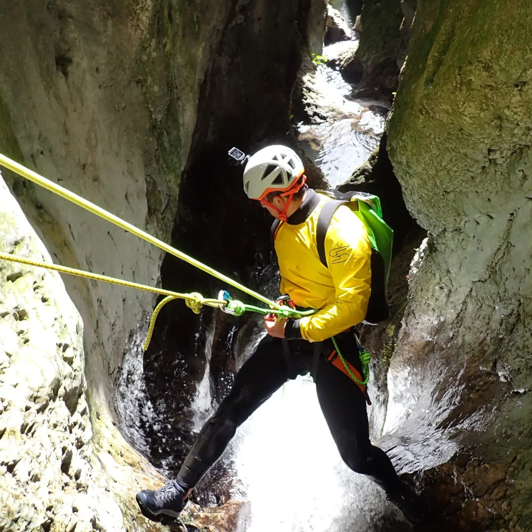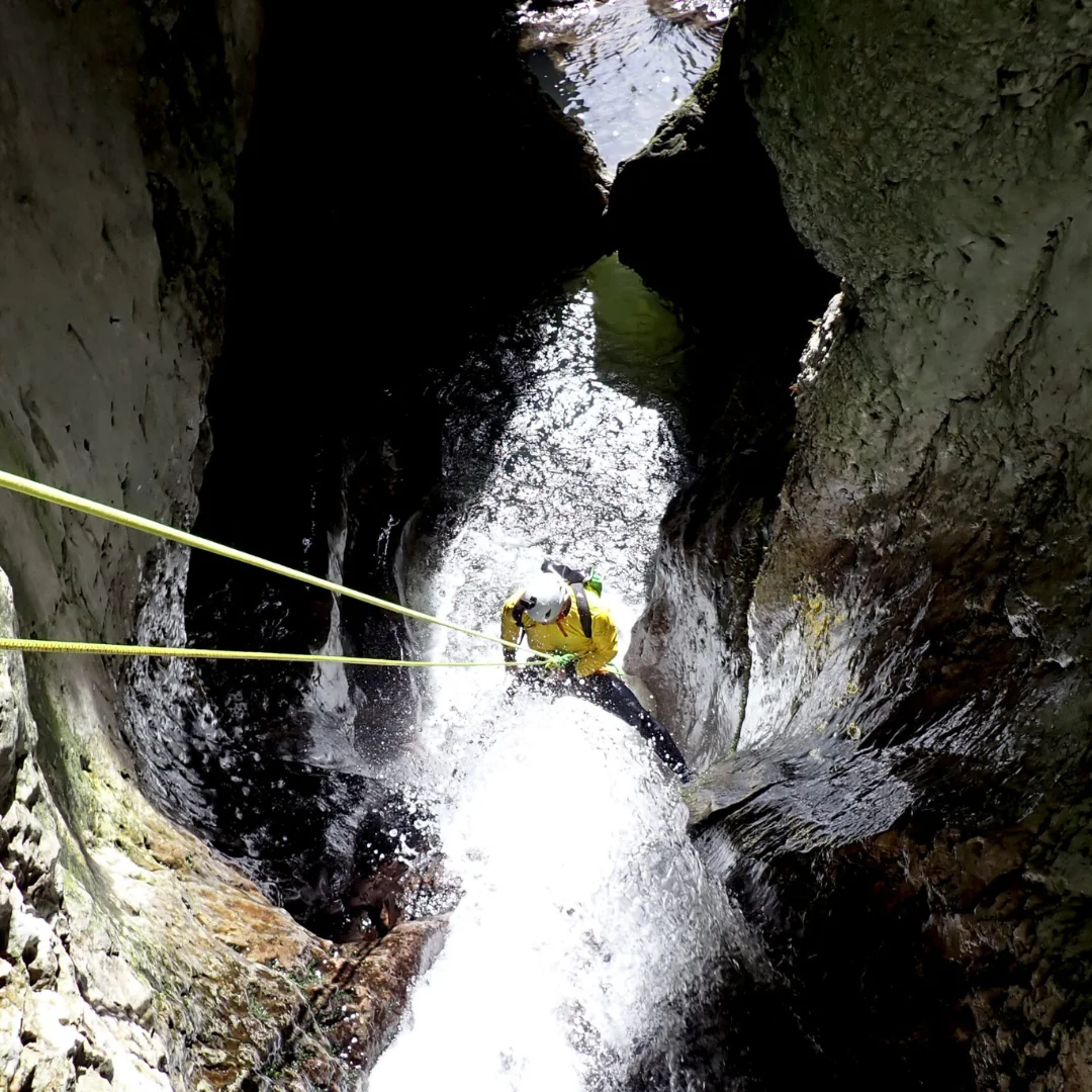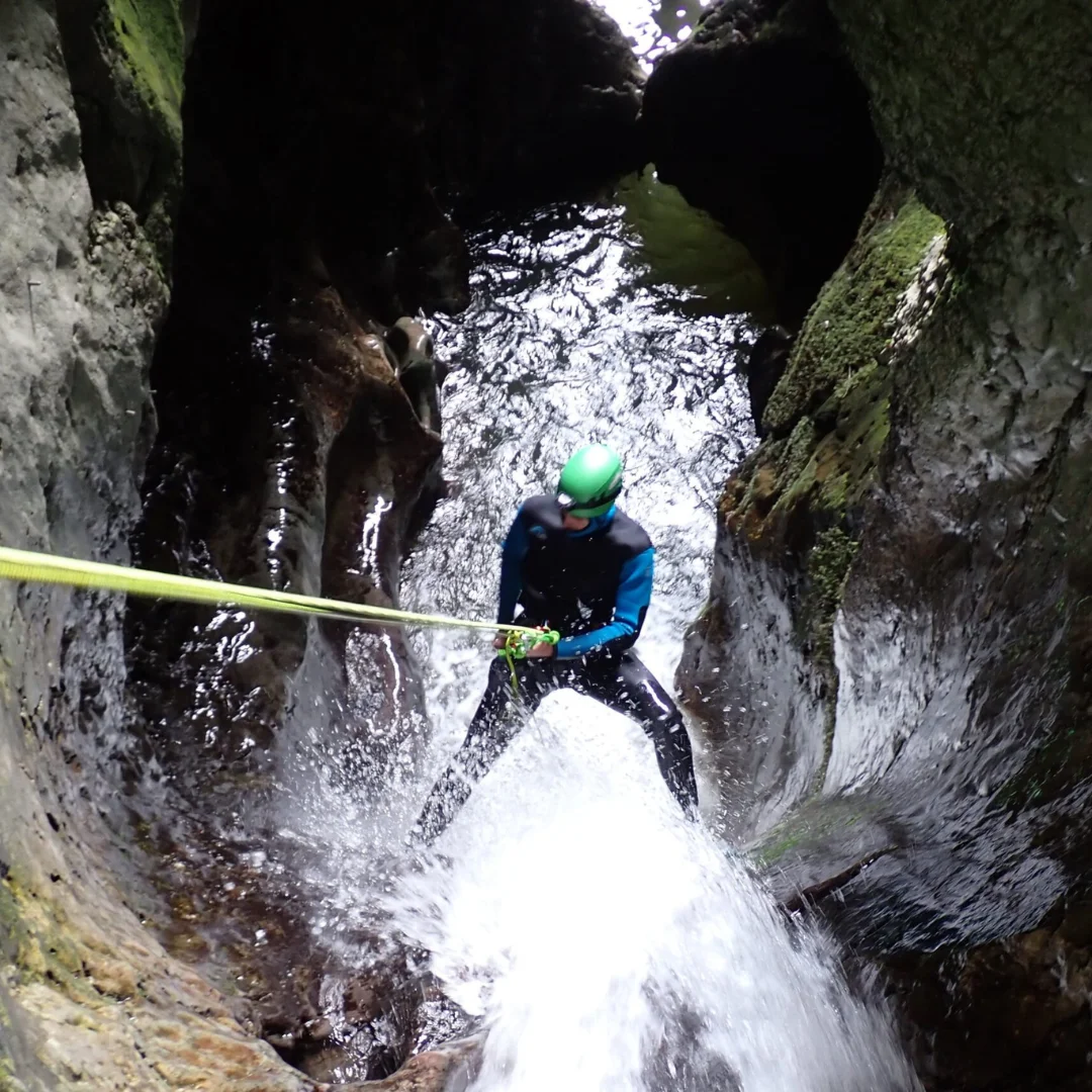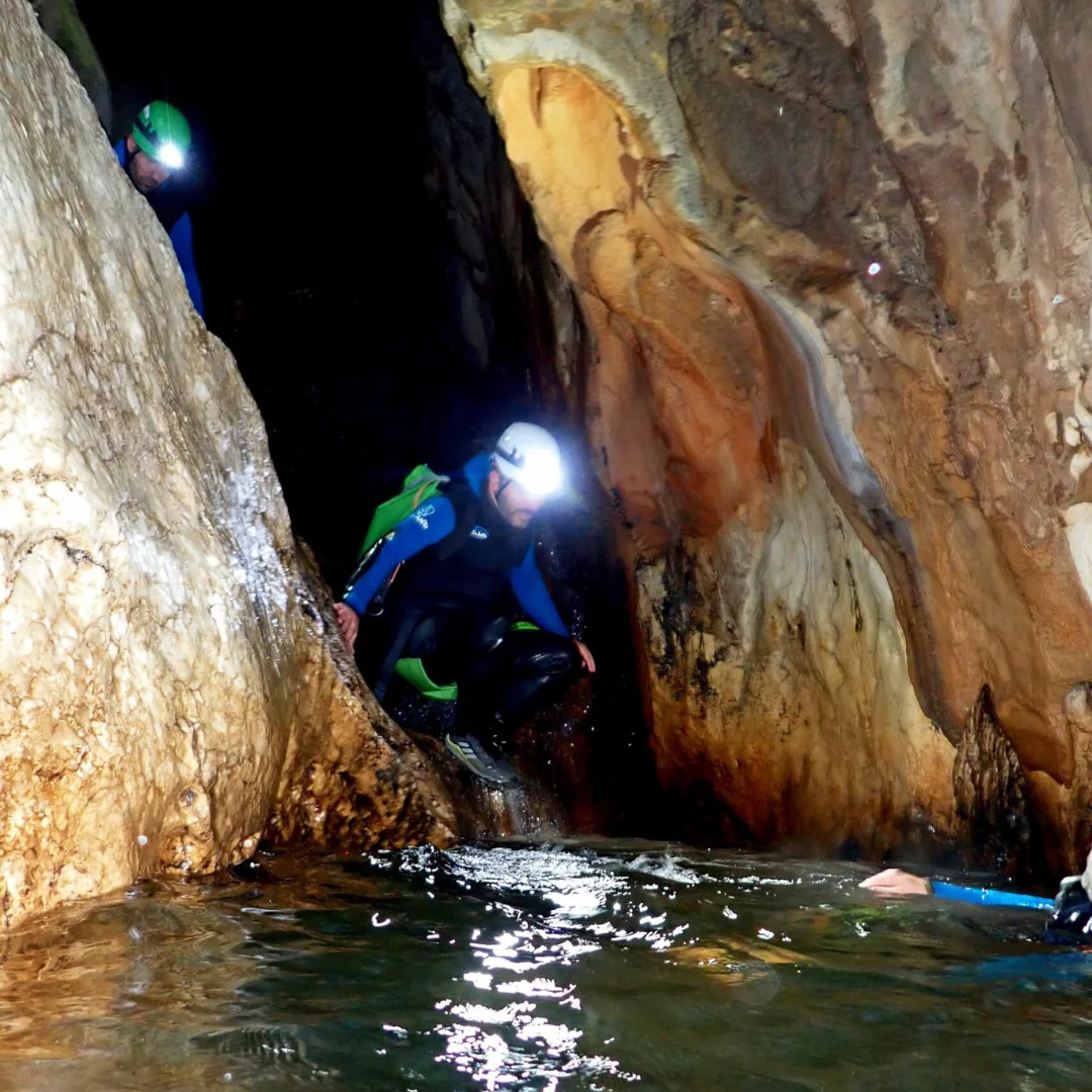 Equipado con un frontal para iluminar el camino, avanzarás sorteando el desnivel entre la boca de entrada y la de salida. Caminaremos por el agua y, en algunos tramos, será necesario nadar. A lo largo del recorrido, nos encontraremos con rápeles de hasta 16 metros, un par de saltos opcionales de hasta 3 metros y divertidos toboganes naturales que añadirán emoción a la aventura. Esta actividad de barranquismo acuático en la Leze es de dificultad iniciación nivel II, por lo que es apta para quienes tengan una forma física media y deseen vivir una experiencia diferente.