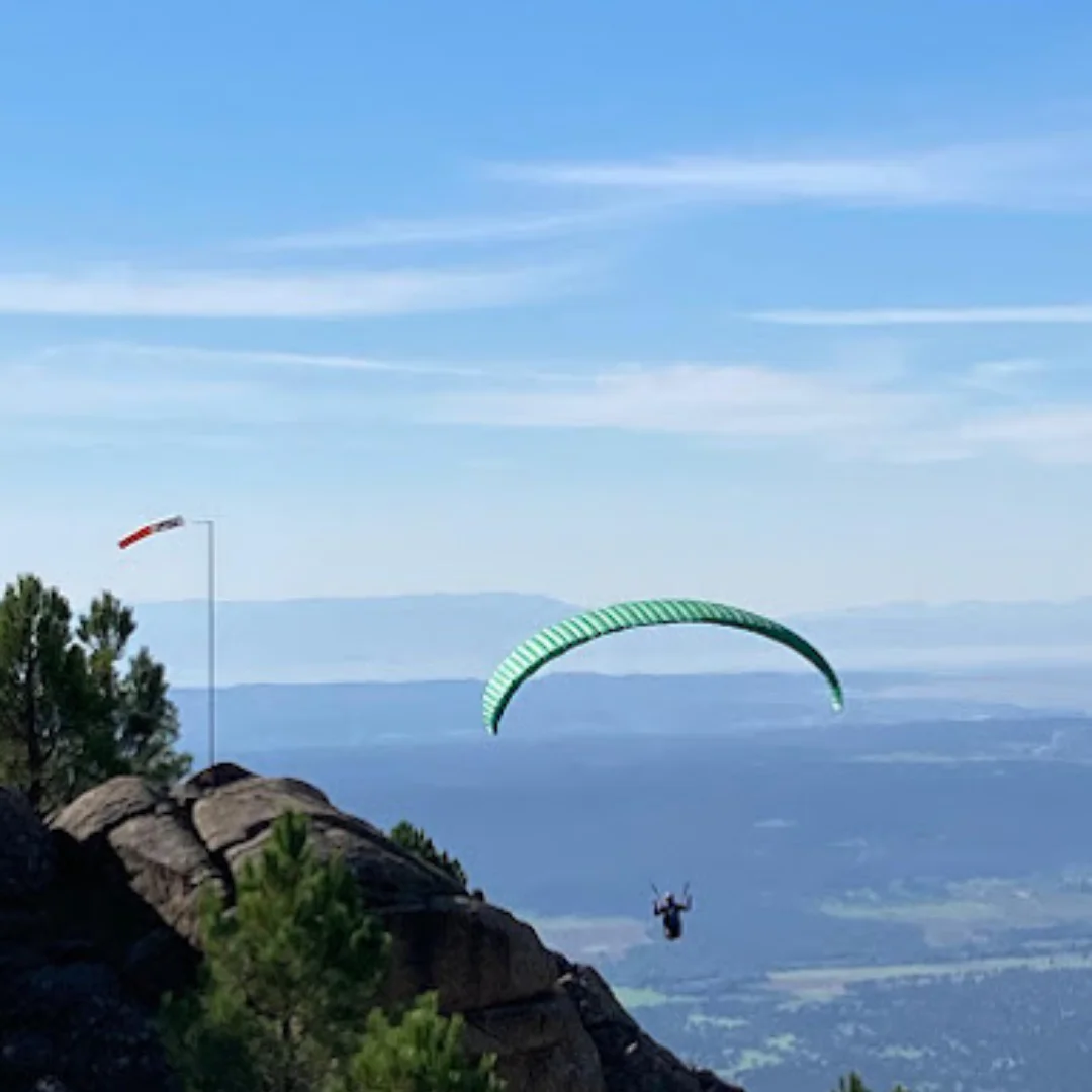 El despegue a 1.800 metros de altitud sobre la Sierra de Guadarrama os permite disfrutar de un gran desnivel y de vistas impresionantes que se abren desde las cumbres agrestes hasta el pantano de Lozoya y parte de la Sierra de la Cabrera. Gracias a los vientos predominantes del norte y noroeste, esta zona ofrece condiciones especialmente favorables para un vuelo suave, estable y muy disfrutable tanto para quienes viven su primer bautismo en parapente como para los más atrevidos que quieren sacar el máximo partido a la montaña.