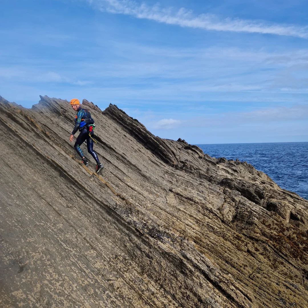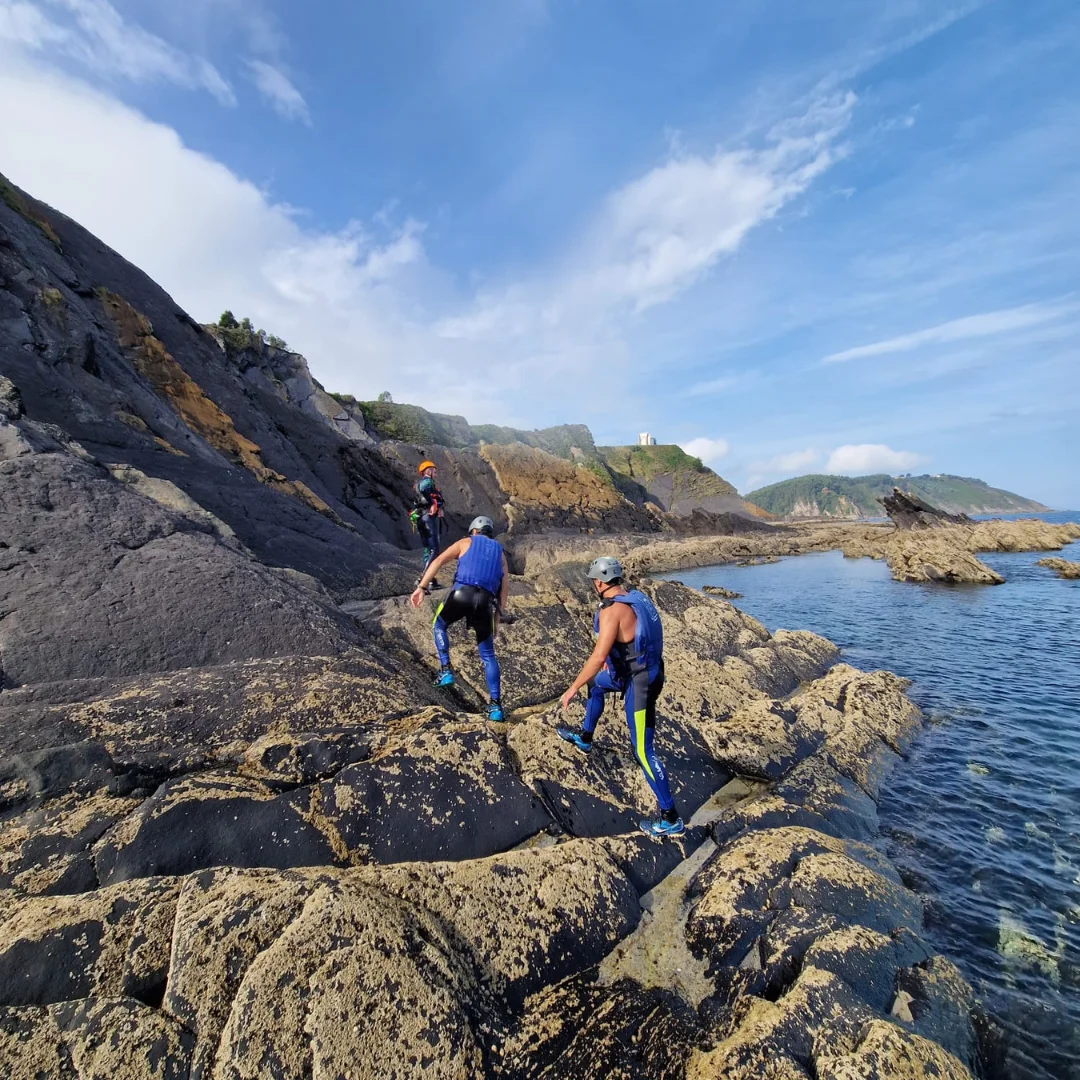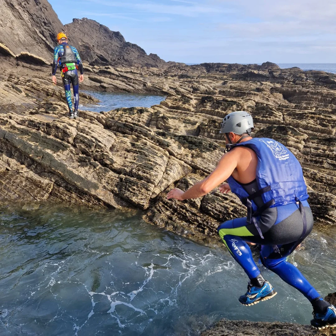 El coasteering en Asturias consiste en un recorrido por la costa que te llevará a caminar sobre los acantilados, trepar por rocas a poca altura sobre el agua y, para los más valientes, saltar al mar desde diferentes alturas. Estos saltos, que pueden variar en dificultad y altura, son la oportunidad perfecta para sentir la adrenalina mientras te sumerges en las refrescantes aguas del Cantábrico. Además, durante toda la actividad, podrás disfrutar de vistas impresionantes del paisaje costero, que combina la fuerza del mar con la serenidad de la naturaleza asturiana.