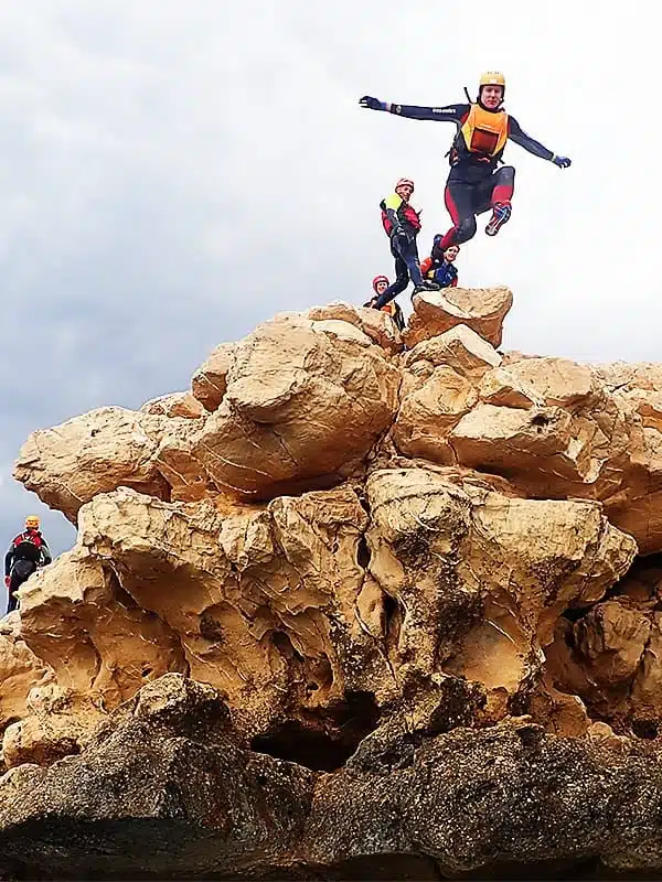 A lo largo del recorrido combinamos saltos al mar, progresión por roca, nado en aguas claras y exploración de cuevas marinas, siempre con guía y con el ritmo adaptado al grupo. No se trata de “hacerlo todo a cualquier precio”, sino de disfrutar del entorno con seguridad: proponemos pasos y saltos acordes a las habilidades del grupo y os acompañamos en cada tramo para que viváis la experiencia con confianza.
