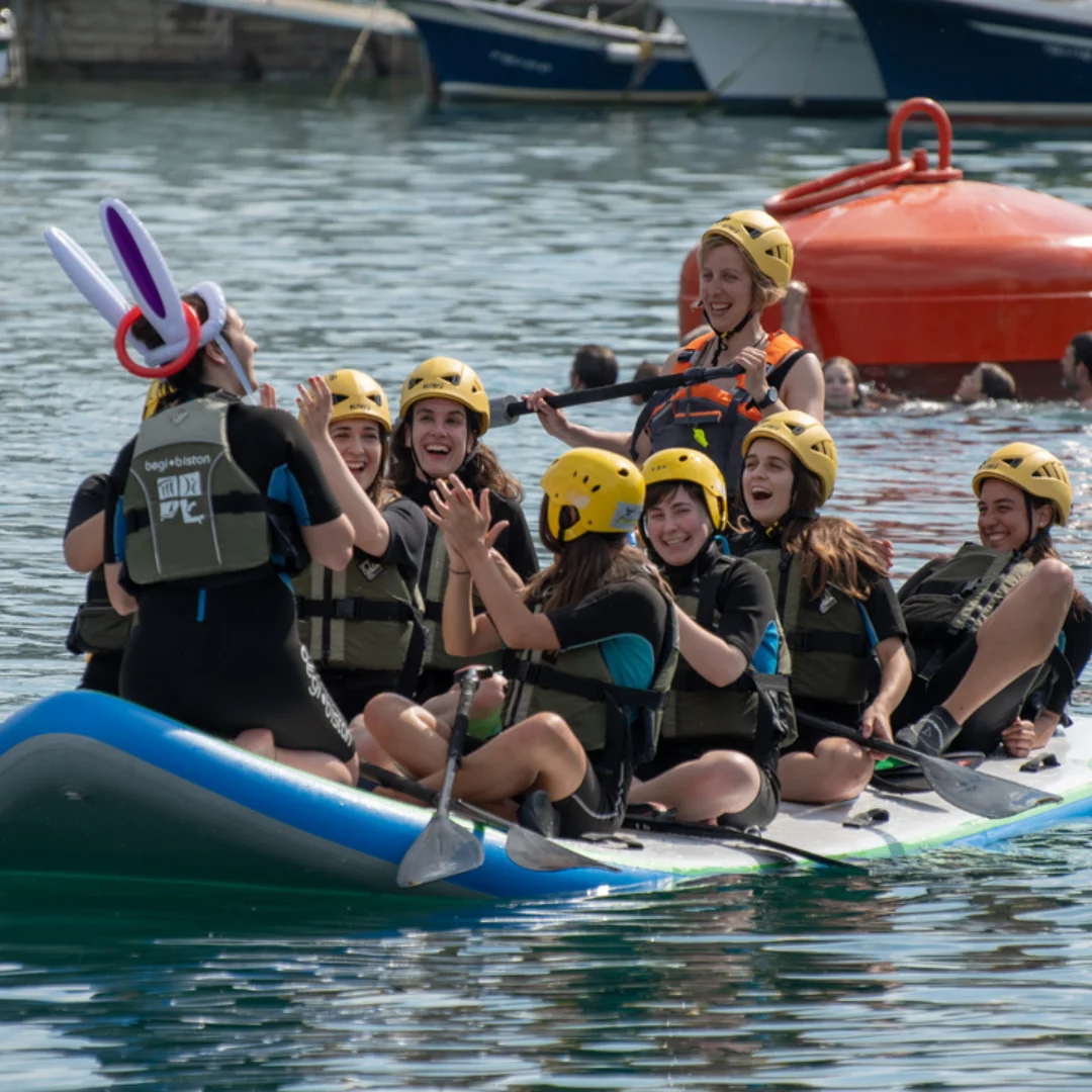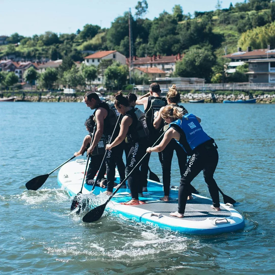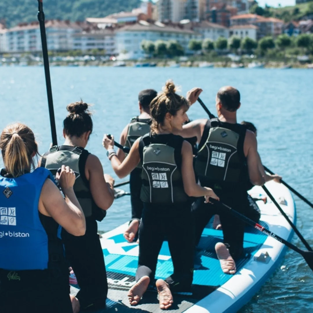Durante la aventura, remaremos en equipo sobre la gran tabla de paddlesurf, realizando paradas en diferentes puntos de Orio donde podrás explorar los encantos del pueblo y, si lo deseas, hacer una pausa para disfrutar de una consumición en alguno de sus bares locales. Es importante recordar que el coste de estas consumiciones no está incluido en la actividad, y cada grupo será responsable de su gasto.