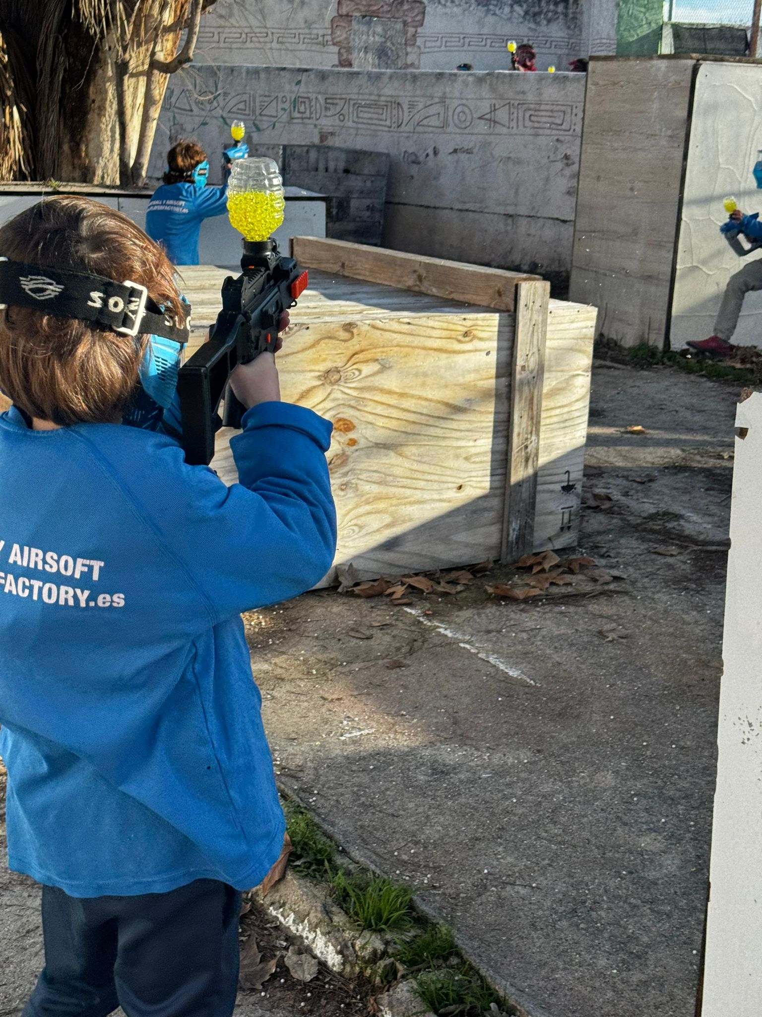 Para jugar utilizamos un lanzador Gelblaster “Minifusil” eléctrico, con modo de disparo automático adaptado a los más pequeños. Todo el material se revisa antes de cada actividad y se explica su funcionamiento de forma clara y sencilla, poniendo siempre la seguridad por delante de la velocidad de juego.
