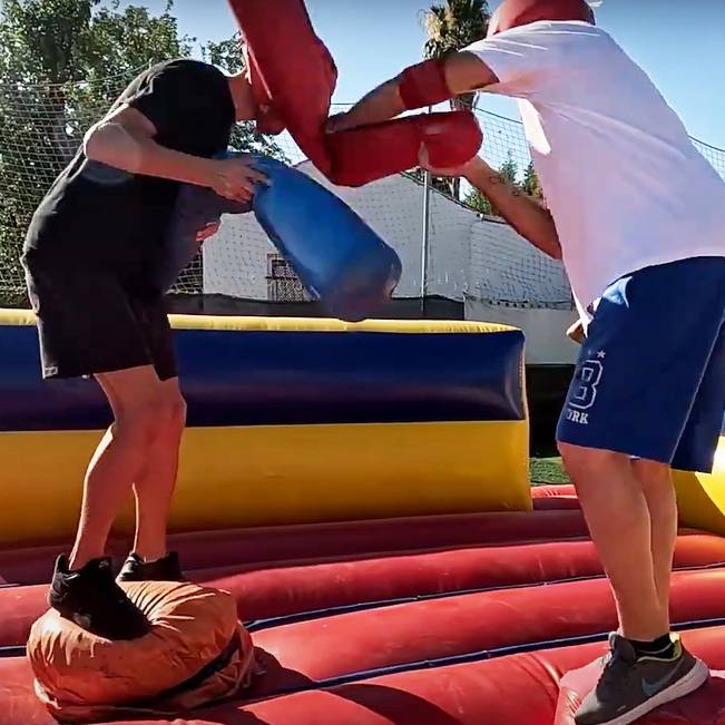 La “Lucha de Gladiadores” es uno de los momentos más esperados. Los niños suben por turnos a plataformas elevadas dentro de un ring hinchable, protegidos con casco y equipamiento acolchado. El reto es mantener el equilibrio mientras intentan desequilibrar al oponente con bastones blandos, siguiendo siempre las indicaciones del monitor y con normas claras de seguridad.