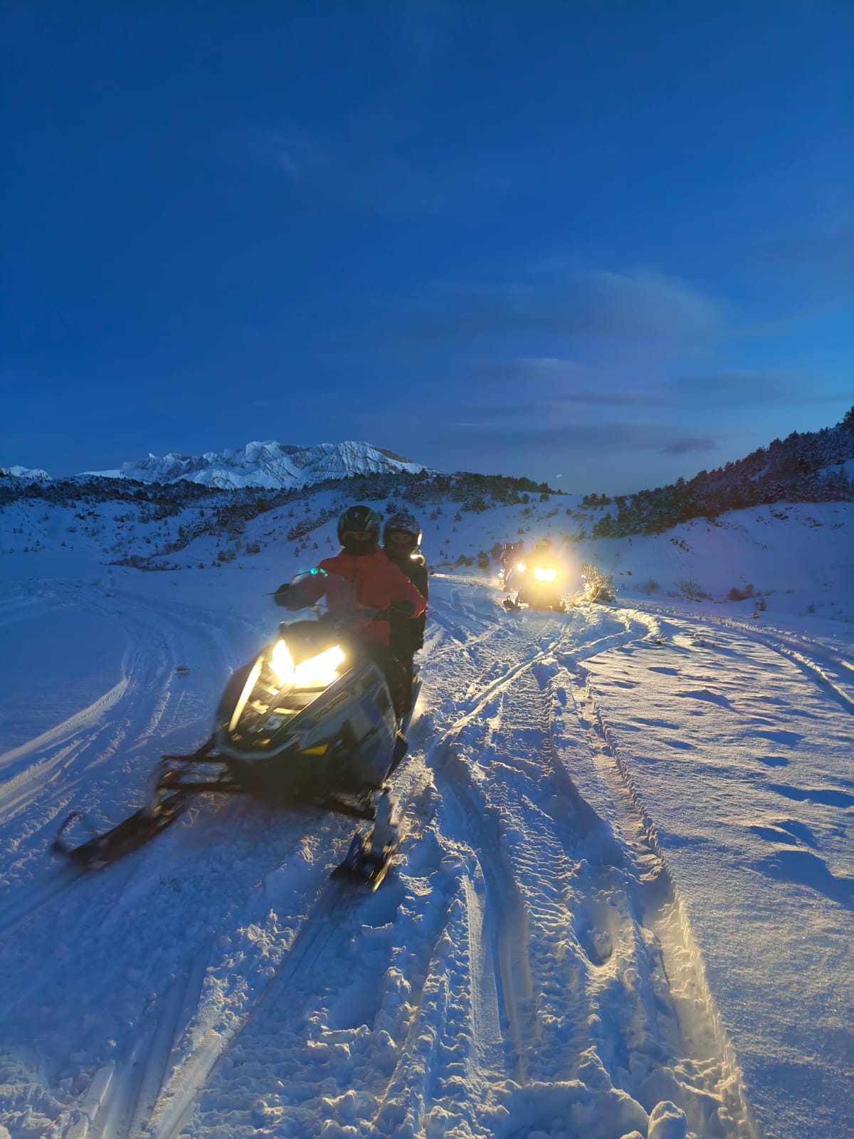 Durante las 2 horas de ruta en moto de nieve atravesamos valles pirenaicos, claros de bosque y zonas de alta montaña, con vistas hacia el ibón de las Paules, el ibón de Escarra y el valle de Escarra. Aprovechamos varias paradas para que puedas hacer fotos, disfrutar del silencio y observar cómo cambia la luz sobre las paredes del circo glaciar que domina la zona. La combinación de conducción y atardecer convierte esta salida en una experiencia muy visual y memorable, muy cercana a una auténtica moto de nieve nocturna en el Pirineo Aragonés, ya que terminamos en una franja horaria en la que el valle se sumerge casi por completo en la oscuridad y destacan las luces del refugio.