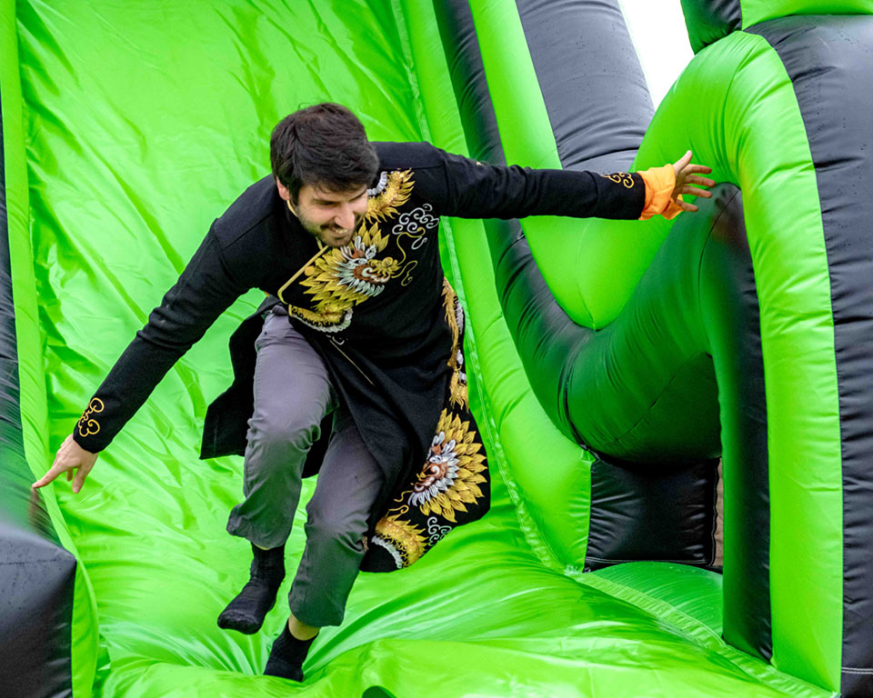 Pista Americana: pista hinchable de 16 metros con obstáculos; carrera competitiva y gana quien cruza la meta primero.
