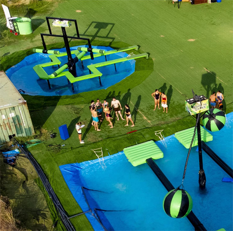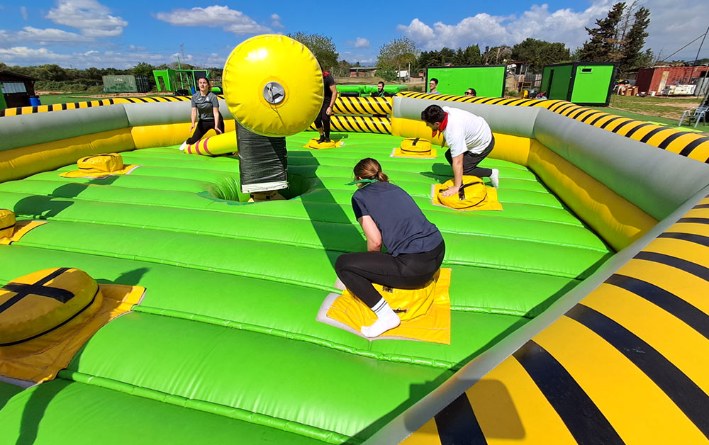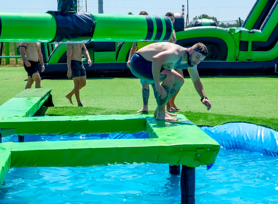 La Trituradora: pasarela flotante con rodillos hinchables girando para hacerte perder el equilibrio.