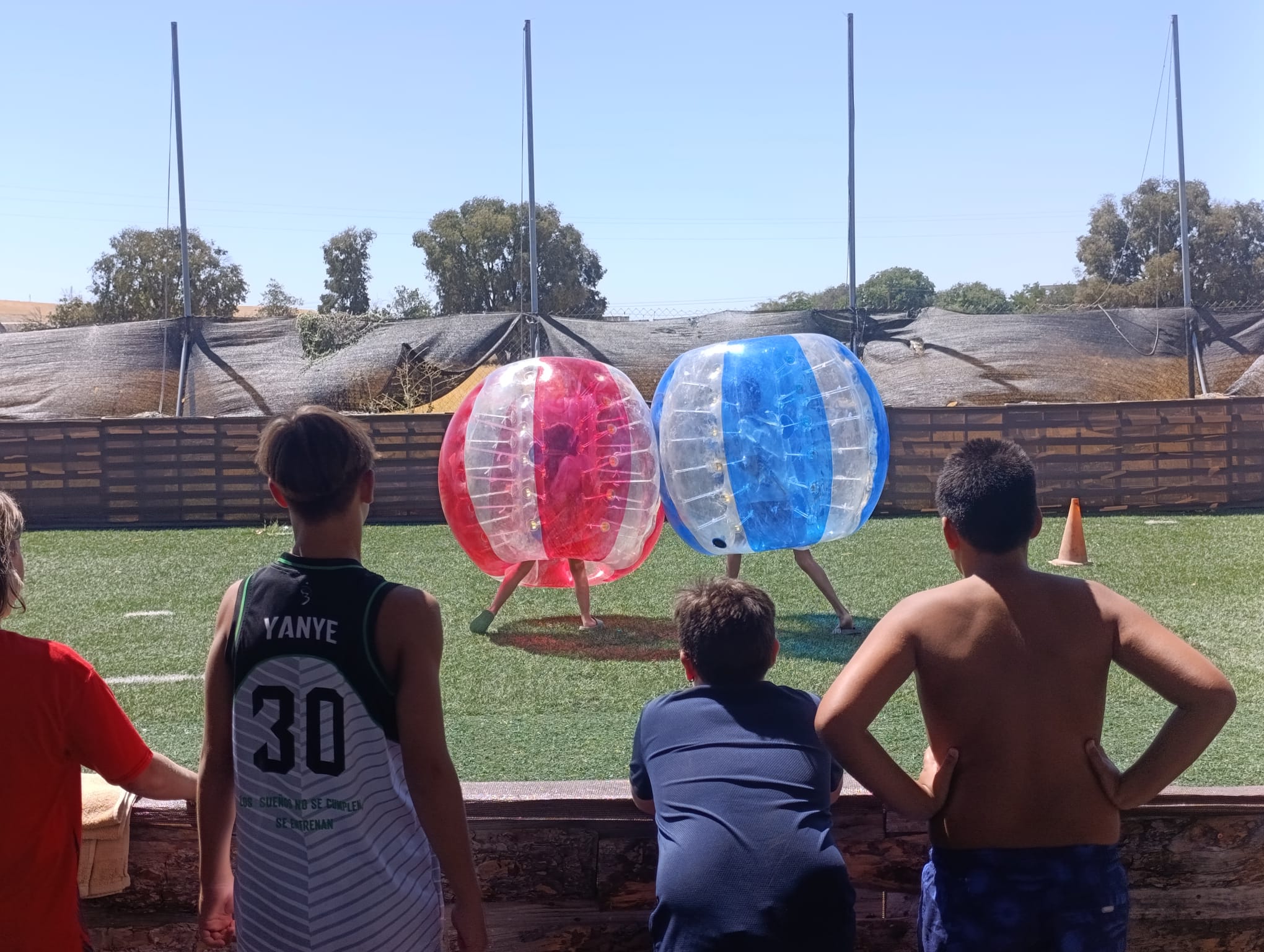 Las Olimpiadas Locas para niños se desarrollan en formato gymkana, con pruebas por equipos pensadas para fomentar el compañerismo y la diversión. Los peques participan en juegos como “Súper Salchicha Derby”, “Bubble Clash”, “Guantes Locos” o “Lucha de Gladiadores”, todos con superficies hinchables y materiales acolchados. Se trata de un humor amarillo adaptado a su edad, donde la prioridad es la seguridad y las risas.