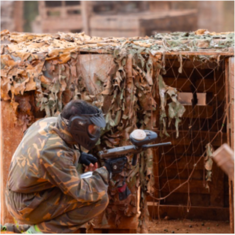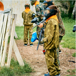 El paintball infantil está concebido para que los niños disfruten con total seguridad. A su llegada, se les entrega toda la indumentaria de protección necesaria: peto, protecciones para cuello y espalda y máscara integral que cubre el rostro. Para jugar, utilizan una marcadora de muelle específica para niños, con disparos de pintura de baja potencia, pensada para ofrecer impactos suaves y controlados, manteniendo la diversión sin necesidad de fuerza excesiva.