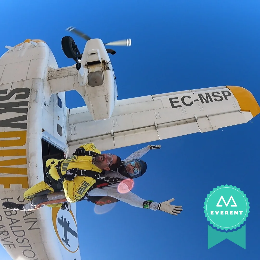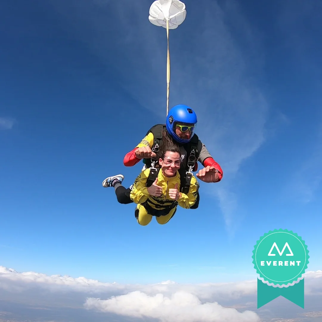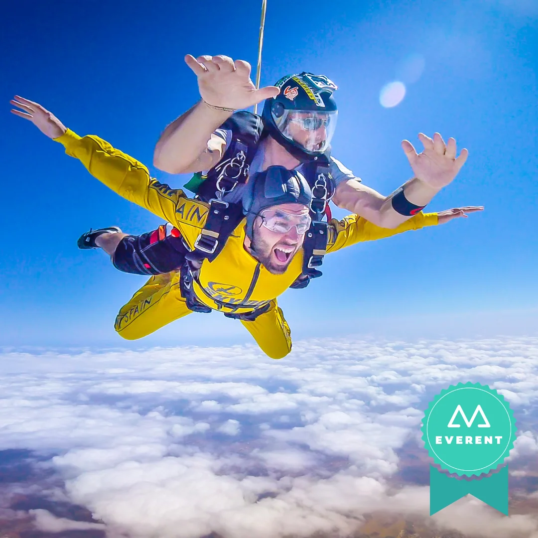 Si no tienes experiencia previa, no debes preocuparte. El salto tándem en paracaídas en Sevilla es la opción perfecta para quienes desean vivir esta aventura por primera vez. Saltarás acompañado de uno de nuestros instructores, por lo que ellos te guiarán y acompañarán en todo momento. Experimentaréis un minuto completo en caída libre alcanzando una velocidad de hasta 130 mph. Además, alcanzaréis la altitud de salida comercial más alta del mundo, nada más y nada menos que ¡15.000 pies!