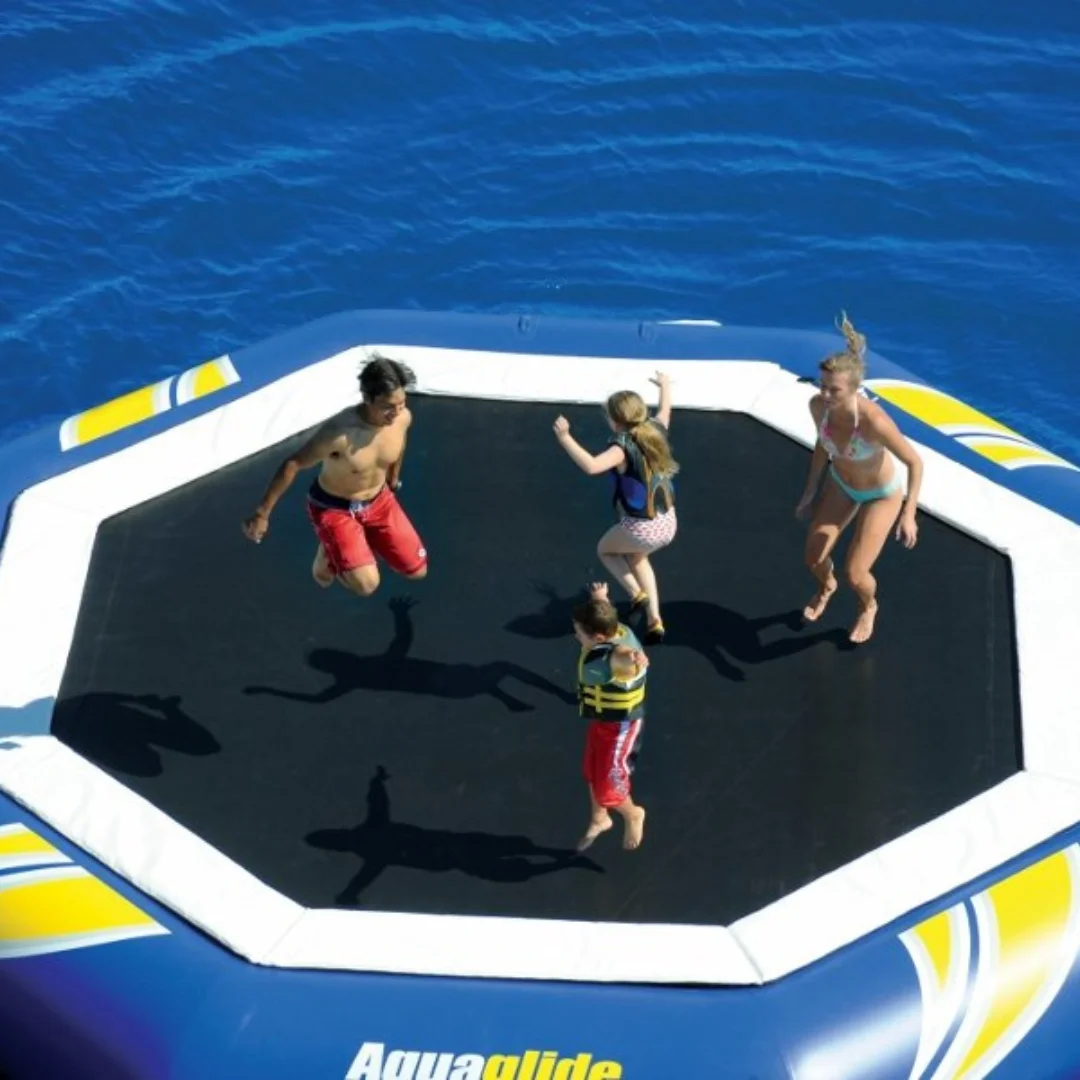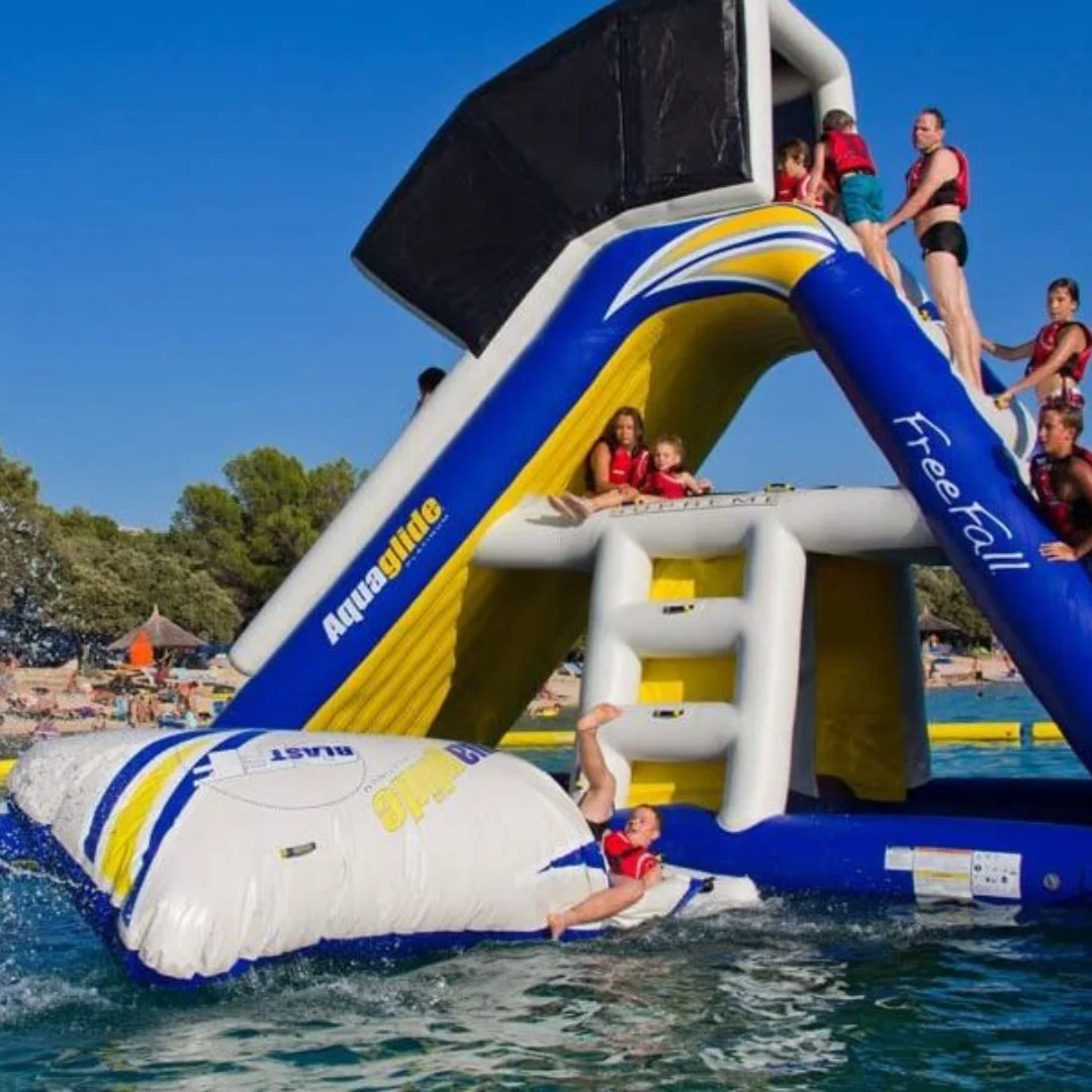 Las atracciones incluyen los emocionantes toboganes gigantes, donde podrás deslizarte desde más de 7 metros de altura y sentir la velocidad mientras caes al agua. Para los más pequeños, ofrecemos un tobogán adaptado que garantiza diversión en un entorno seguro. Si eres amante de los saltos y las volteretas, la cama elástica sobre el agua te hará liberar toda tu energía mientras disfrutas del mar. Además, nuestra jungla hinchable es una yincana que pondrá a prueba tu destreza, con opciones adaptadas en la mini jungla para los más pequeños, quienes tendrán su espacio exclusivo para disfrutar.
