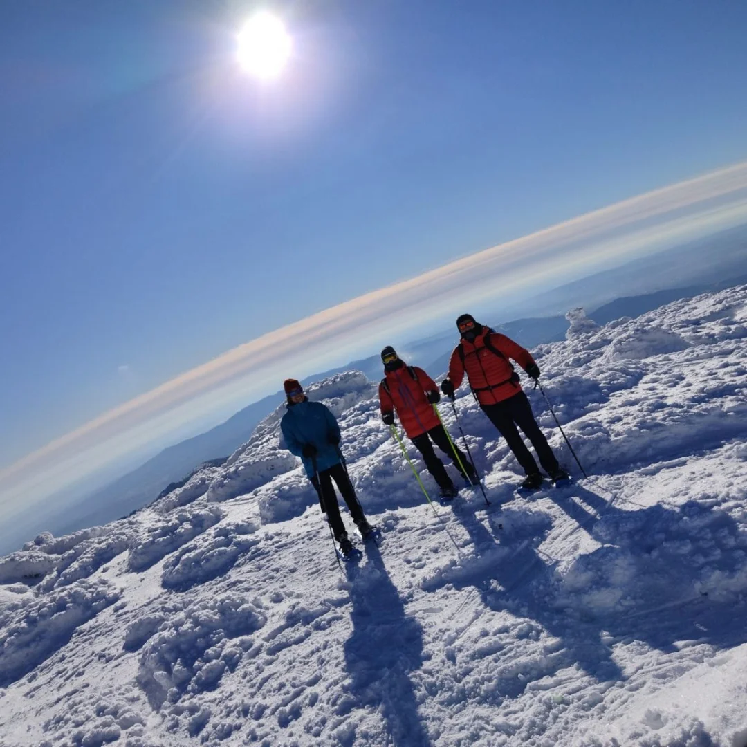 Durante la excursión, de aproximadamente 8 km, haremos paradas para apreciar a fondo las vistas, tomar fotografías, e incluso hacer un pequeño picnic y reponer energías inmersos en un entorno de naturaleza único. En el camino de vuelta aprovecharemos toda la nieve virgen que nos haya regalado la climatología y sentiremos el placer de avanzar sobre un tupido lecho de nieve bajo nuestros pies.
